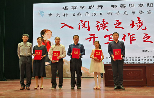 曹文軒教授為襄陽的五位“楚天少兒悅讀季全民閱讀推廣人”頒發證書