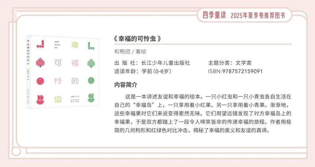 近日,國家圖書館少年兒童館發布了國圖少兒館重磅推薦|“四季童讀”2025年夏季卷。長江少年兒童出版社《幸福的可憐蟲》入選“四季童讀”2025年夏季卷書單學前段(0-6歲)·文學類。