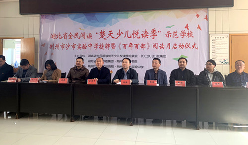 何新陸宣布“楚天少兒悅讀季”暨《百年百部》閱讀月啟動并致辭。他表示,自2016年起,沙市實驗中學開展“堅持讀”活動,通過“教師領讀,學生自讀,寫閱讀說說”三步走模式,引導學生有效閱讀。應以此次授牌為契機,深化閱讀活動,積累閱讀成果,引領師生和家長參與閱讀活動,推進學習型社會建設。
