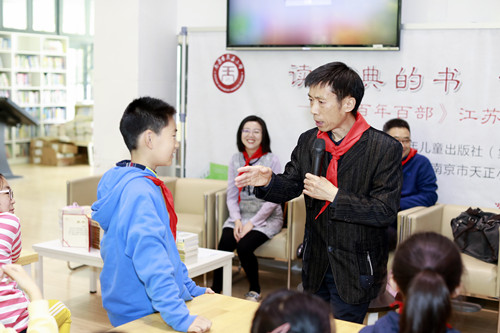 姚蘇平現(xiàn)場梳理了江蘇兒童文學(xué)多年來取得的成就,給孩子們逐一介紹了葉圣陶、曹文軒、金曾豪、黃蓓佳、王巨成、祁智、王一梅等多位江蘇籍兒童文學(xué)作家,特別是他們?nèi)脒x《百年百部》的《稻草人》《草房子》《蒼狼》《我要做好孩子》《我們的小時候》《芝麻開門》《鼴鼠的月亮河》等作品。姚蘇平認為,這些作家跟長江少兒出版社一樣,都是做的培根鑄魂的事情,他們共同用明德引領(lǐng)風尚,向中國乃至世界的孩子講述中國故事、中國童年。