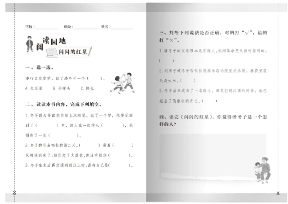 “閱讀園地”板塊:提供整本書(shū)閱讀效果檢測(cè)方法和自主閱讀指導(dǎo)。這既方便老師開(kāi)展閱讀測(cè)驗(yàn),又能讓孩子發(fā)揮主觀能動(dòng)性,在自主學(xué)習(xí)中體會(huì)紅色精神。