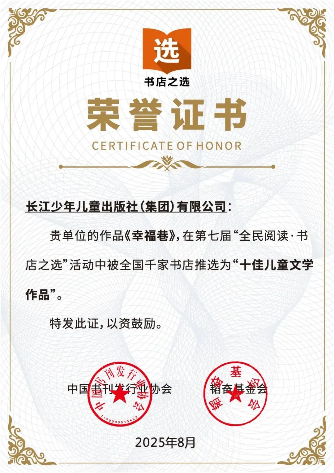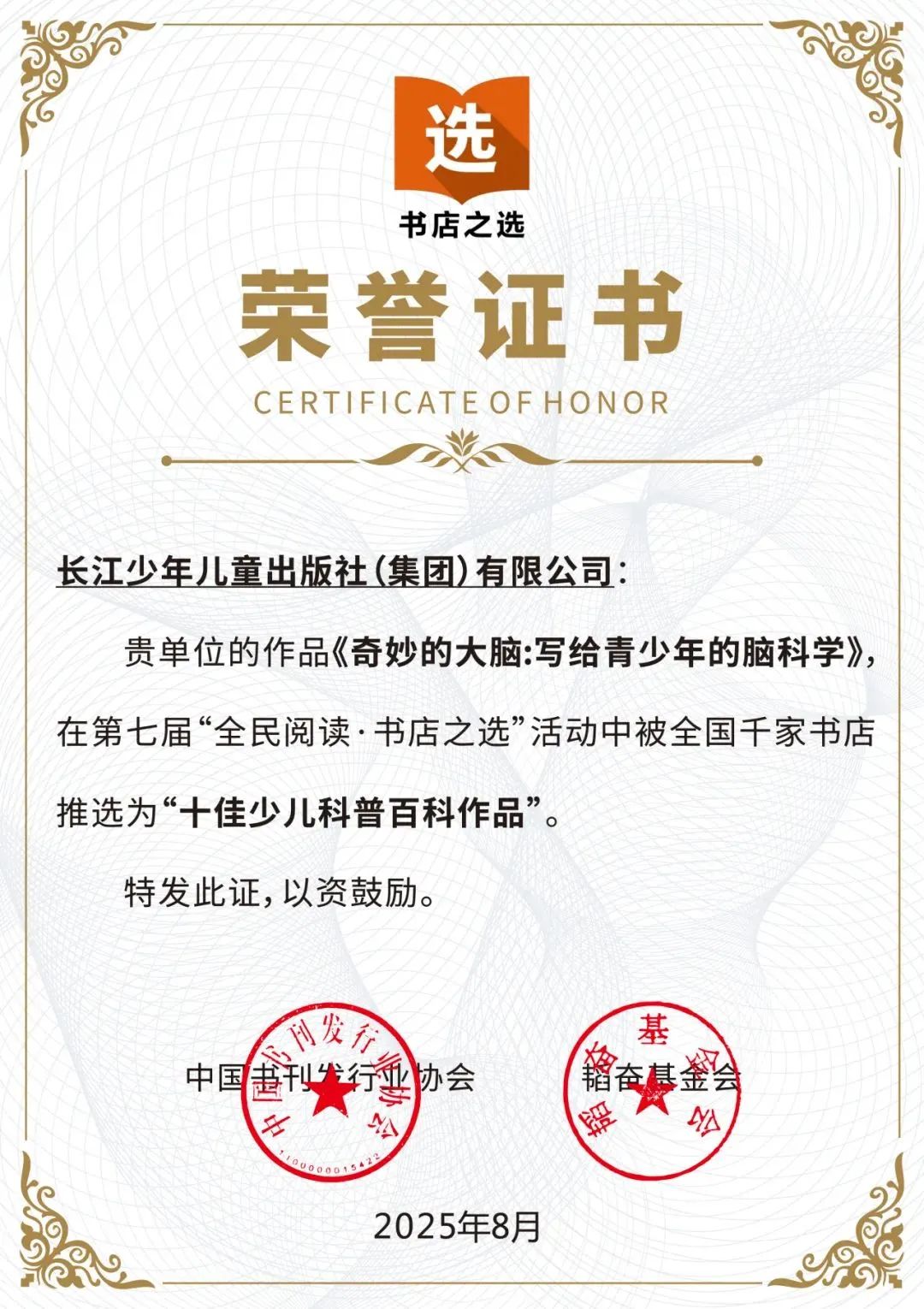 2025年8月15日,第七屆“全民閱讀·書店之選”十佳作品名單在南國書香節上正式發布。長少社《幸福巷》《奇妙的大腦:寫給青少年的腦科學》兩種圖書分別被全國千家書店推選為“十佳兒童文學作品”和“十佳少兒科普百科作品”。