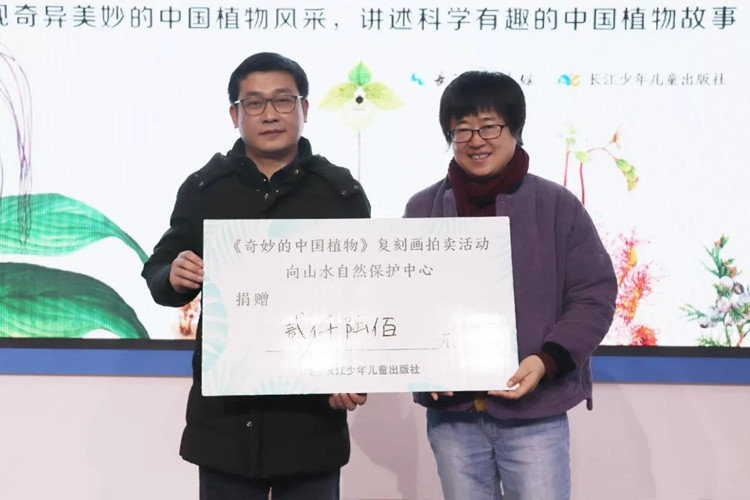 活動現(xiàn)場對書中的6幅精品植物復(fù)刻畫進(jìn)行了公益拍賣,拍賣所得金額由柯尊文總經(jīng)理代表長江少年兒童出版社捐贈給山水自然保護(hù)中心。