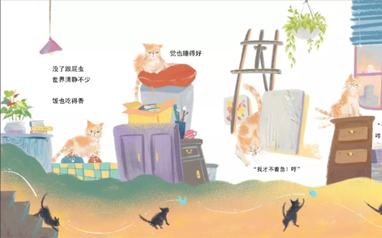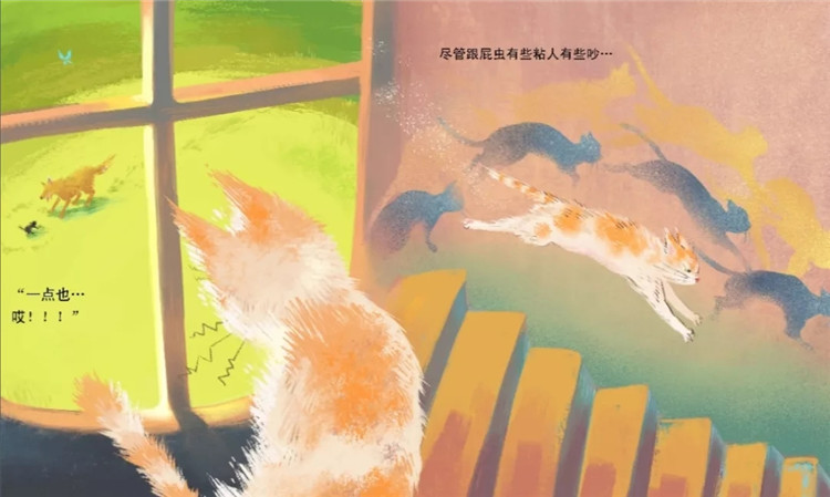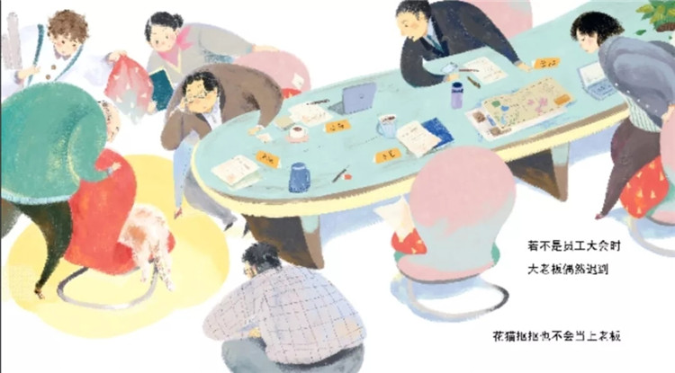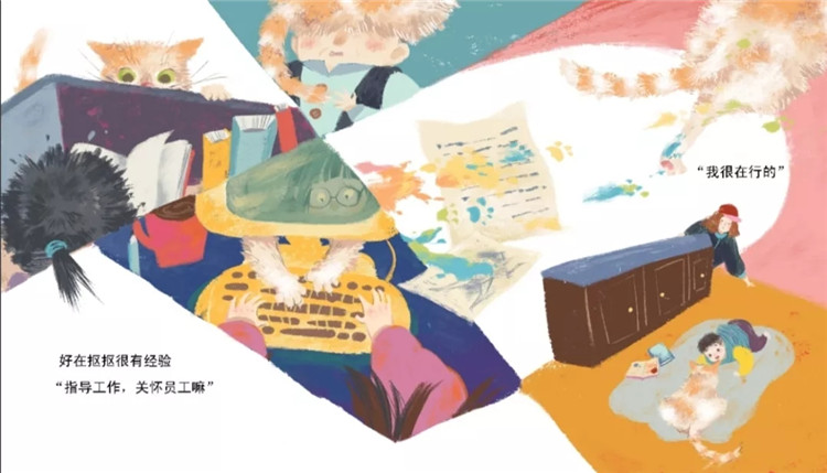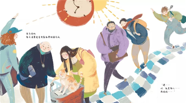 這部作品的人物和貓咪是夸張變形的卡通造型,沒有使用太多的線條,直接用顏色畫型,喜感十足,整體色調(diào)簡潔明快,給人一種放松心情的愉悅感受。