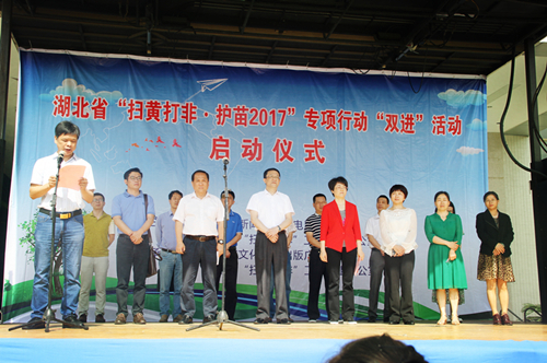 “一道殘陽鋪水中,半江瑟瑟半江紅。可憐九月初三夜,露似真珠月似弓。 ”5月25日,伴隨著學生們朗朗的誦讀聲,由湖北省“掃黃打非”工作小組辦公室、湖北省教育廳、湖北省新聞出版廣電局、湖北省全民閱讀活動領導小組辦公室主辦的湖北省“掃黃打非·護苗2017”專項行動“雙進”活動正式啟幕。
