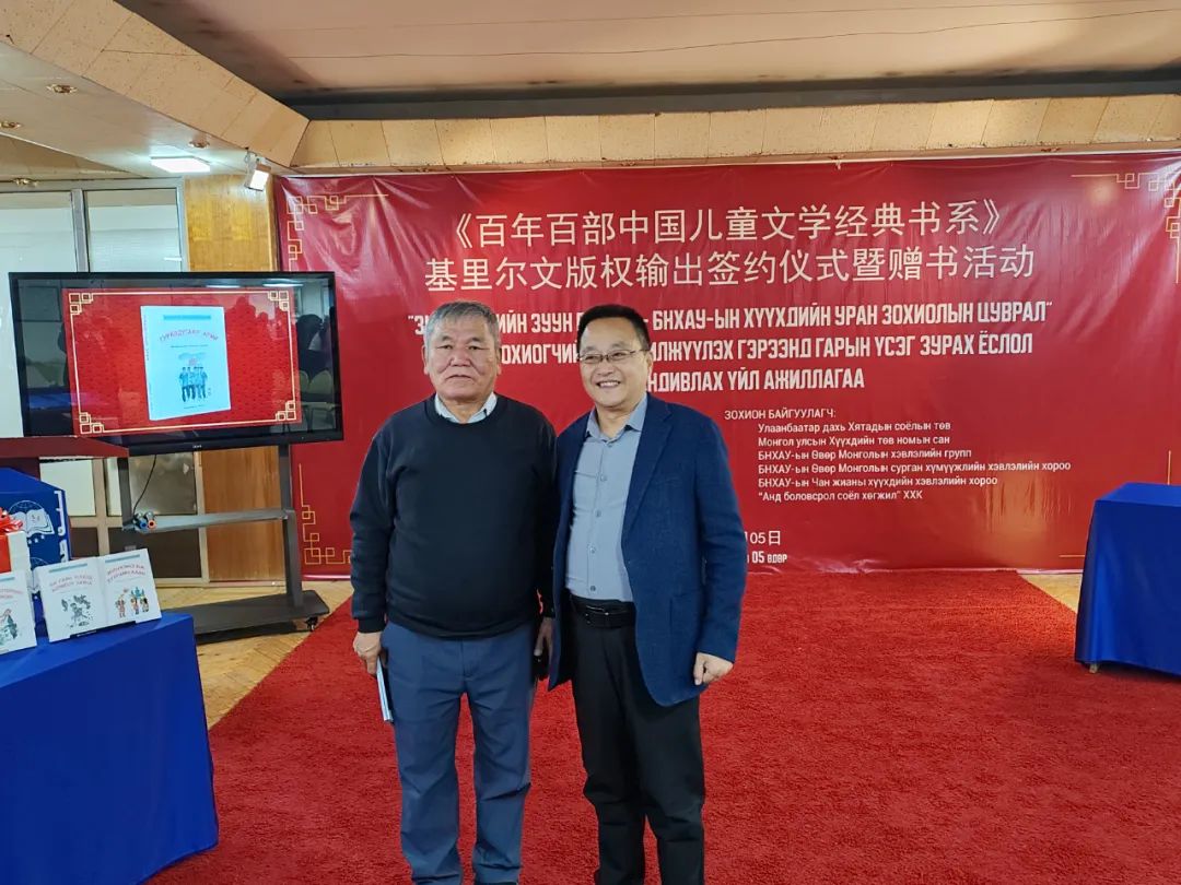 ▲何龍董事長(zhǎng)與蒙古國(guó)著名兒童文學(xué)家鋼·寶力德合影