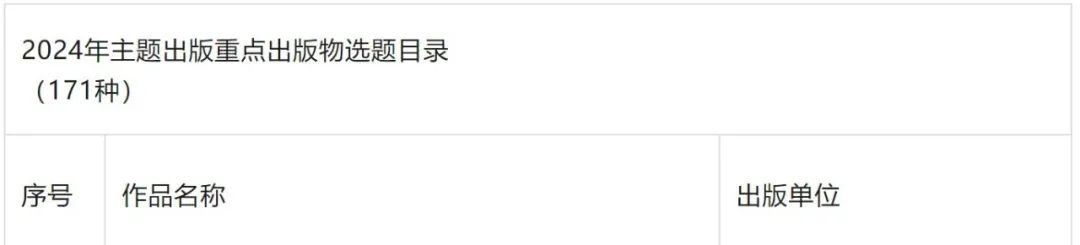 據悉,本次主題出版申報工作,經評審論證,最終確定2024年主題出版重點出版物選題171種,其中圖書選題151種、音像電子出版物選題20種。