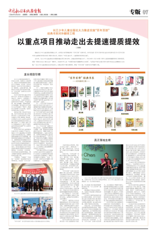 2023年,俄羅斯文化珍品博物館網站對《百年百部中國兒童圖畫書經典書系》進行了詳盡呈現,向俄羅斯出版界大力推介長江少年兒童出版社出版的10余部原創圖書。同一年,“百年百部”圖畫書作品《牛王節》榮獲第29屆斯洛伐克布拉迪斯拉發國際插畫雙年展金蘋果獎,該書于2024年又榮登2024年度“博洛尼亞最佳童書獎驚嘆書架”。