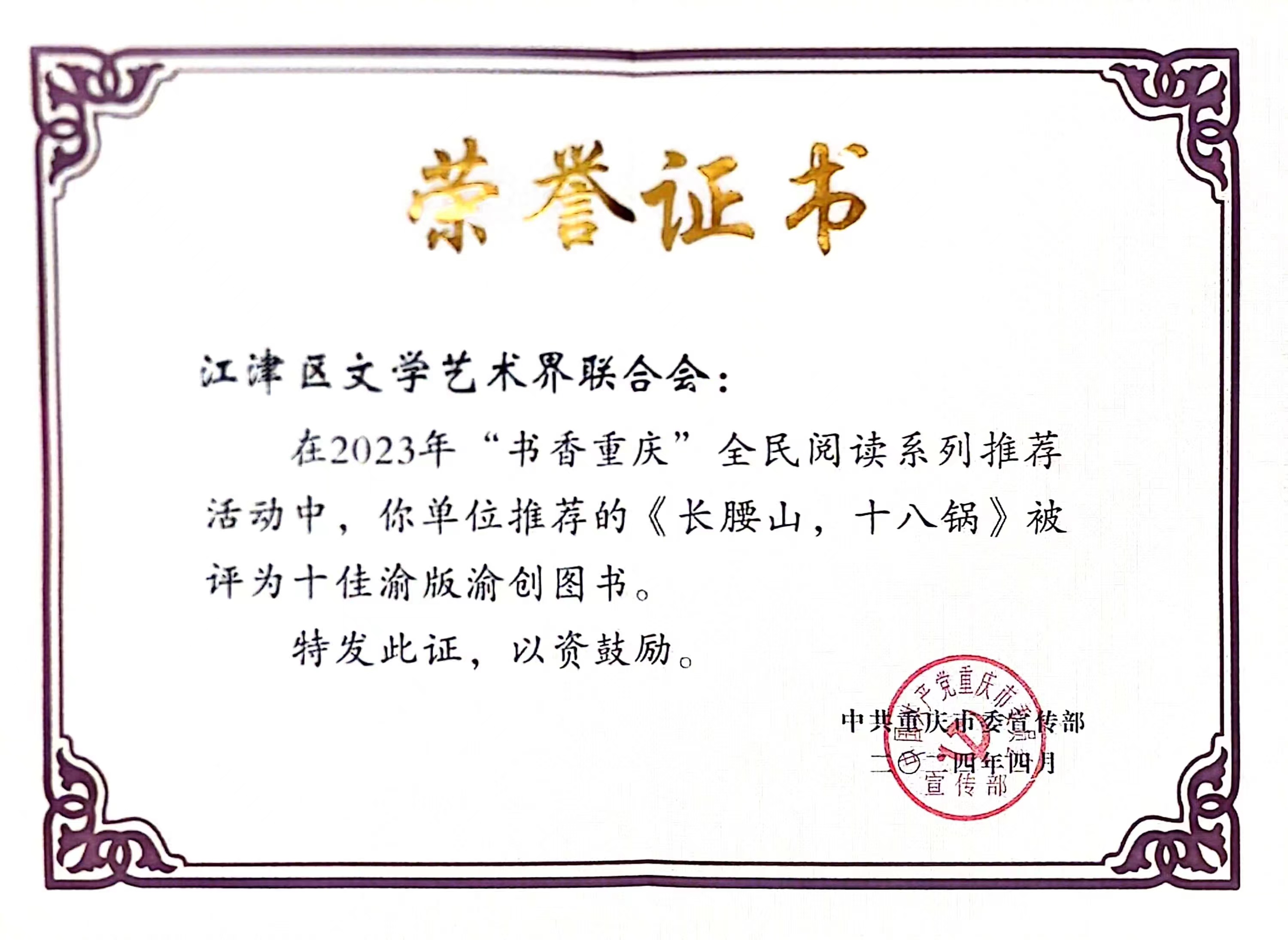 近悅遠來,書香重慶。4月10日,2023年“書香重慶”全民閱讀系列推薦活動獲獎名單揭曉,長江少年兒童出版社出版的長篇兒童文學小說《長腰山,十八鍋》獲評“十佳渝版渝創圖書”。
