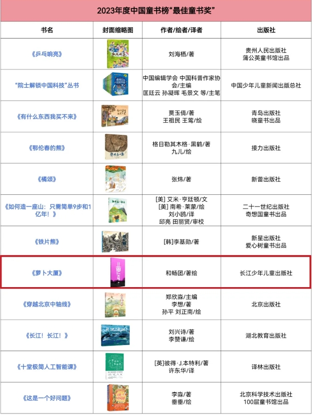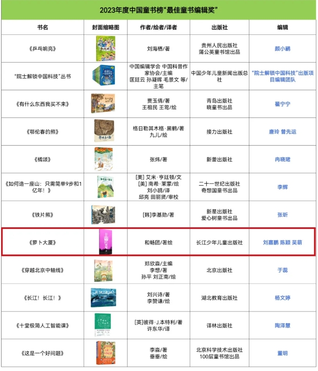 2024年4月2日下午,在第58個“國際兒童圖書日”當天,第十一屆中國童書榜隆重發(fā)布,長江少年兒童出版社《蘿卜大廈》2023年度“最佳童書獎”,本書編輯劉嘉鵬、陳穎、吳萌榮獲“最佳童書編輯獎”。