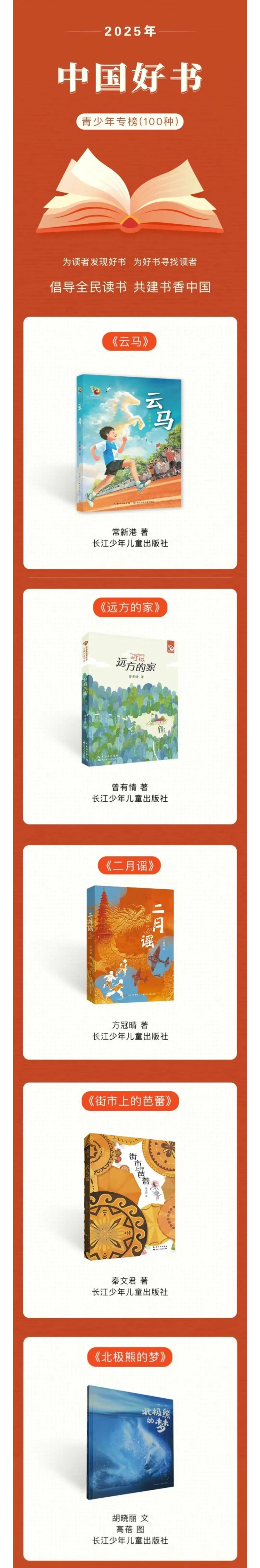 5月30日,2025“中國好書”發布青少年專榜(100種),長江少年兒童出版社5種圖書入選,分別是