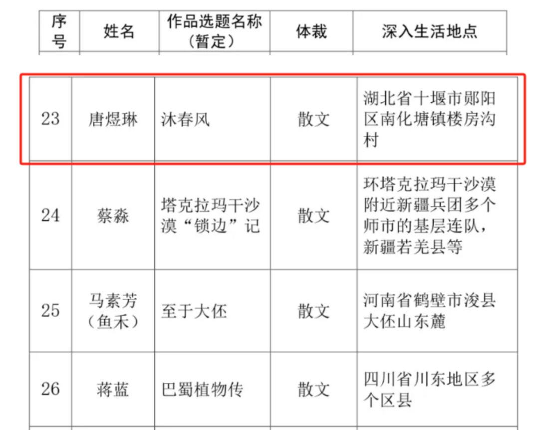 5月28日,中國作家網發布2025年度“作家定點深入生活”項目公告。公告顯示,全國共有41項選題入選。長少社作家、湖北省十堰市作家協會會員唐煜琳的散文集《沐春風》創作計劃位列其中。唐煜琳也是湖北省此次唯一入選該項目的作家。