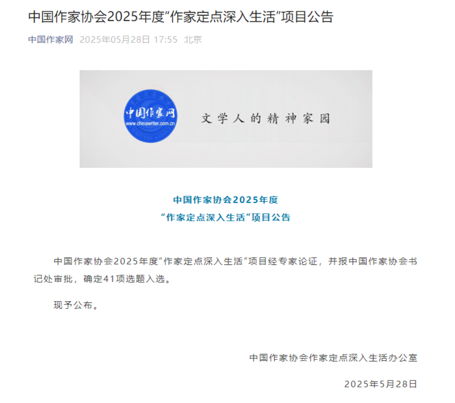 中國作家協會“作家定點深入生活”項目旨在踐行習近平文化思想,進一步推動“深入生活、扎根人民”主題實踐活動走深走實,引導廣大作家在新時代新征程上心懷“國之大者”,聚焦時代主題,堅守人民立場,努力創作更多增強人民精神力量的優秀作品。