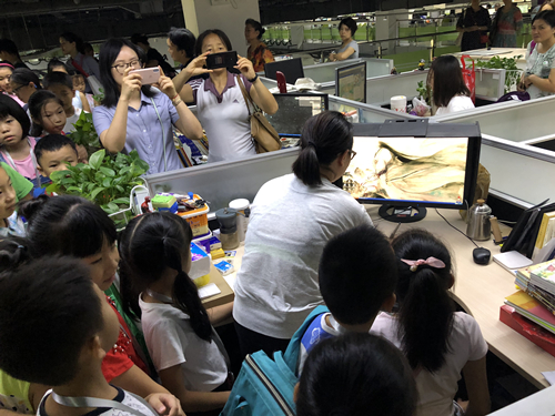 在短短一上午的時間里,由各編輯室老師帶隊,小讀者們分別參觀了精品圖書陳列區、圖書營銷區、編輯工作區、美術設計區、多媒體演示廳等,破解神秘的“詩和遠方”,實地探索、揭秘了圖書誕生的各環節。