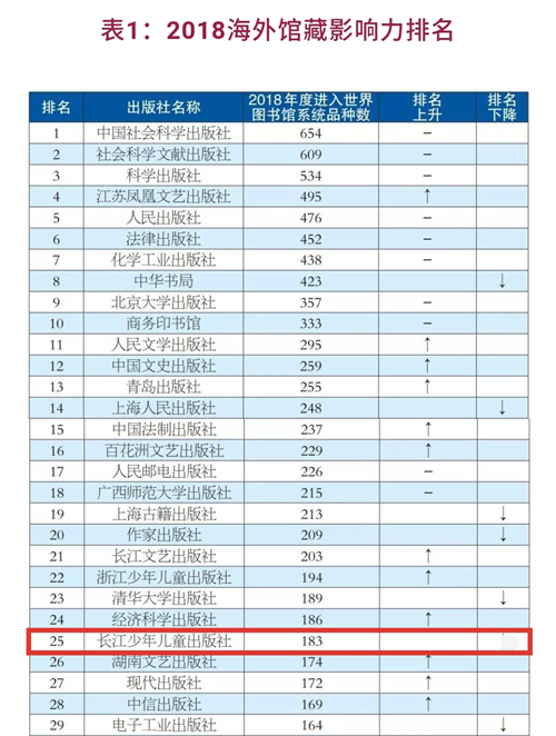 8月22日下午,在第25屆北京國際圖書博覽會上,由中國出版?zhèn)髅缴虉笊纭⒈本┩鈬Z大學中國文化走出去效果評估中心、國際新聞與傳播學院、中國圖書進出口(集團)總公司共同舉辦了“ 2018中國圖書海外館藏影響力報告發(fā)布禮”,在本次發(fā)布會上,長江少年兒童出版社傳來喜訊:在“年度進入世界圖書館系統(tǒng)品種數(shù)”一項重要統(tǒng)計中,我社共計有183個品種入選,位列全國出版社第25位,專業(yè)少兒社類第2名。